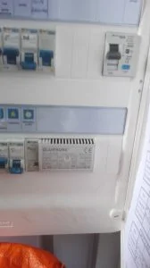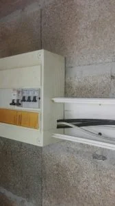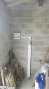 Maintenant (hier exactement) on démarre l’alimentation du garage en tirant un cable depuis la maison (un 3G2.5 suffira vu la faible consommation en puissance que je demanderai au garage) et la pose du tableau électrique (équipé provisoirement car il s’agit de récup) et j’ai tiré depuis le tableau un cable dans la gaine que nous avions réservée pour alimenter la fosse (un prise + un néon) fosse que nous avons du piquer au marteau piqueur car la gaine d’alimentation de celle-ci était descendue lorsque nous avions coulé la chape et les fondations du garage.