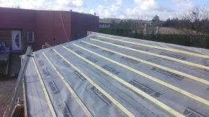 Entre temps on pose un écran HPV2 (pare pluie) avant le litelage sur le garage (certains conseilleront un double litelage pour éviter que les trous des pointes du premier litelage ne créent une entrée d’eau sur les chevrons mais nous n’avons jugé cela nécessaire